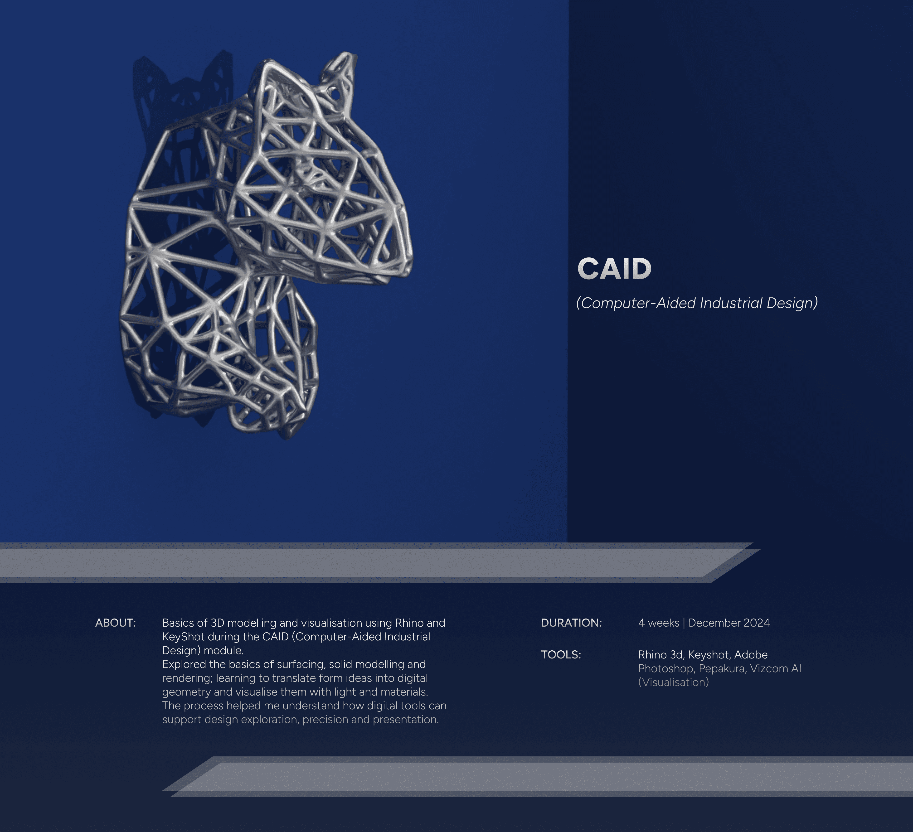 A compilation of my first exposure to 3D modelling and visualisation as part of the Computer-Aided Industrial Design (CAID) course.